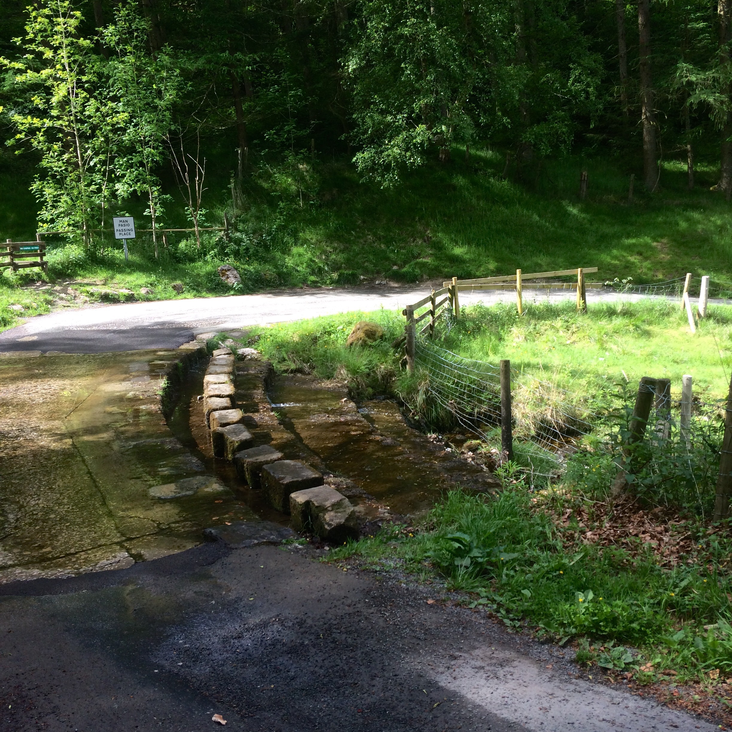 It was soon time to start the descent towards Llangollen, but there was the tackling of a Ford to get across first…which thankfully happened with no dramas! So I could relax and carry on down the country lanes with scrag rock dominating the skyline on one side, and tall trees on the other.